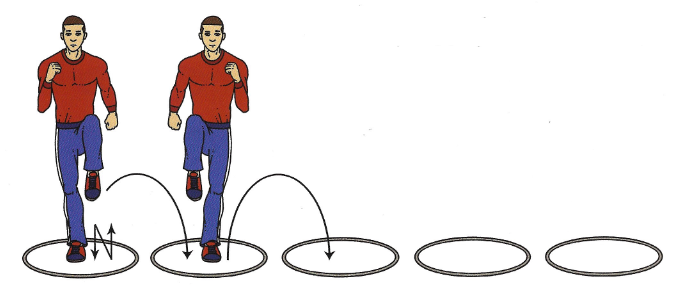 Oldalsó szökdelés karikáról karikára; két talajérintés egy karikában.